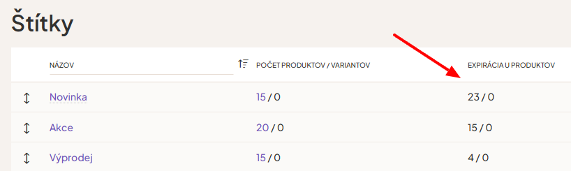 Zoznam produktov, u ktorých štítok expiruje a bude odobraný, nájdete po prekliknutí odkazu pod poľom Expirácia štítkov. Poprípade môžete využiť rozšírenú filtráciu v zozname produktov.