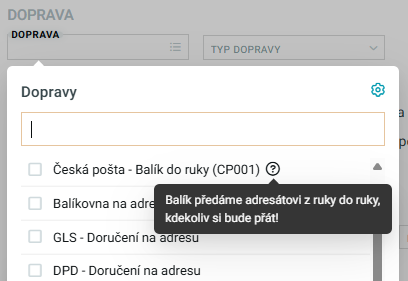 Prebehla zmena v poliach pre výber doprav v administrácii. Jedná sa o pole, ktoré vyhľadáva a filtruje dopravy nad určitými zoznamami (Objednávky, Platby, atď.), ale aj pri editácii dopravy napríklad v detaile objednávky. Teraz už nie sú vypísané všetky dopravy naraz formou mnohých checkboxov. Všetko teraz nájdete prehľadne v novom selecte, ktorý navyše ešte ukazuje dodatočné informácie okrem bežného názvu.
