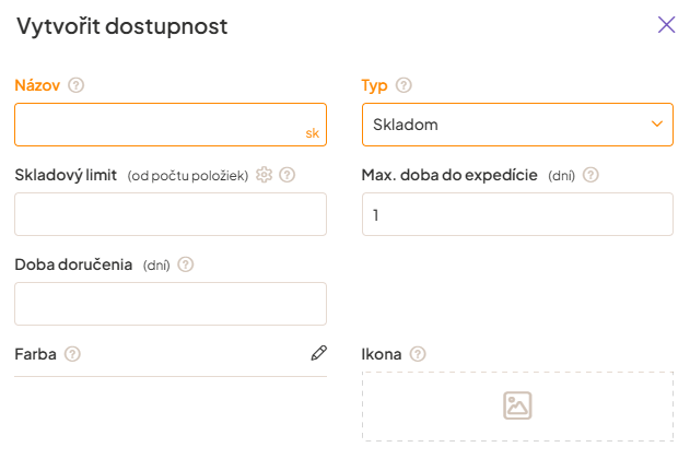 Aby bolo možné pridať produktom jednotlivé dostupnosti, je potrebné ich najskôr vytvoriť a nastaviť, kedy sa majú zobrazovať. Pri každom stave dostupnosti nastavujete okrem iného nasledujúce pole.