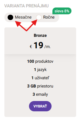 V ďalšom kroku si vyberte vhodný variant prenájmu e-shopu podľa počtu produktov a diskového priestoru. Na výber máte tiež spôsob účtovania za prenájom e-shopu - na mesačnej alebo ročnej báze.
