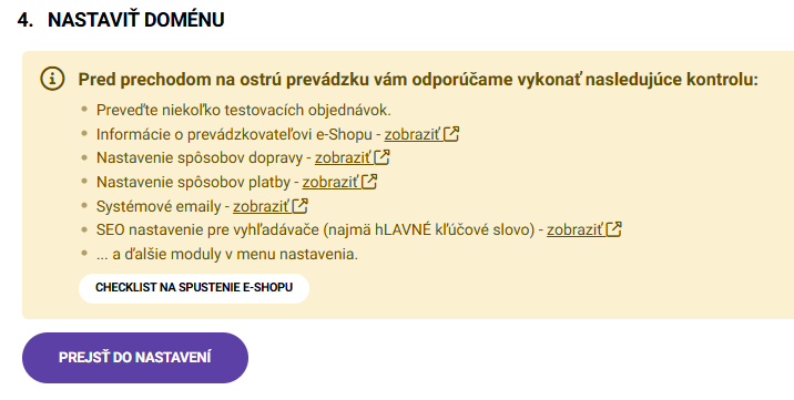 - Predtým ako pristúpite k nastaveniu 4. kroku peňaženky, vykonajte záverečnú kontrolu správnosti nastavenia e-shopu pred jeho ostrým spustením.
