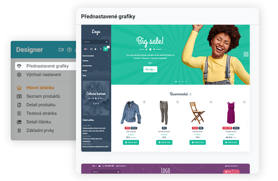V module designer sme pripravili 10 grafických návrhov, ako by mohol váš e-shop vyzerať. Môžete si vybrať jeden z nich alebo si vytvoriť celkom iný, podľa vašich požiadaviek a potrieb.